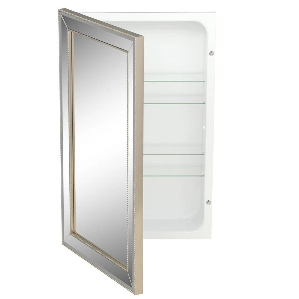 This 16 in. x 26 in. recessed medicine cabinet is a great way to brighten your bath decor. Cabinet features a beautifully hand crafted beveled mirror inlaid with quarter inch champagne beading. The reversible door opening offers installation flexibility and three adjustable glass shelves will accommodate your belonging.