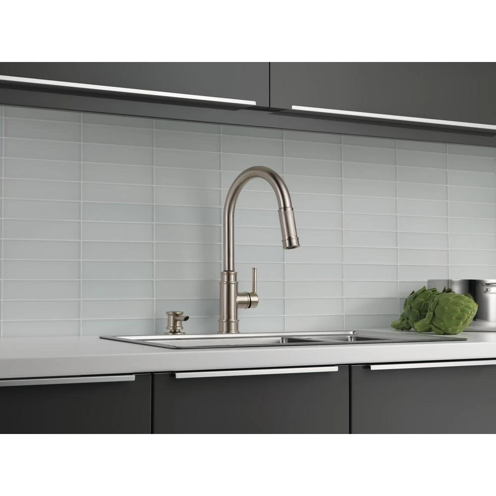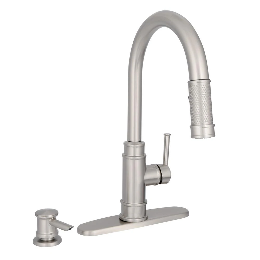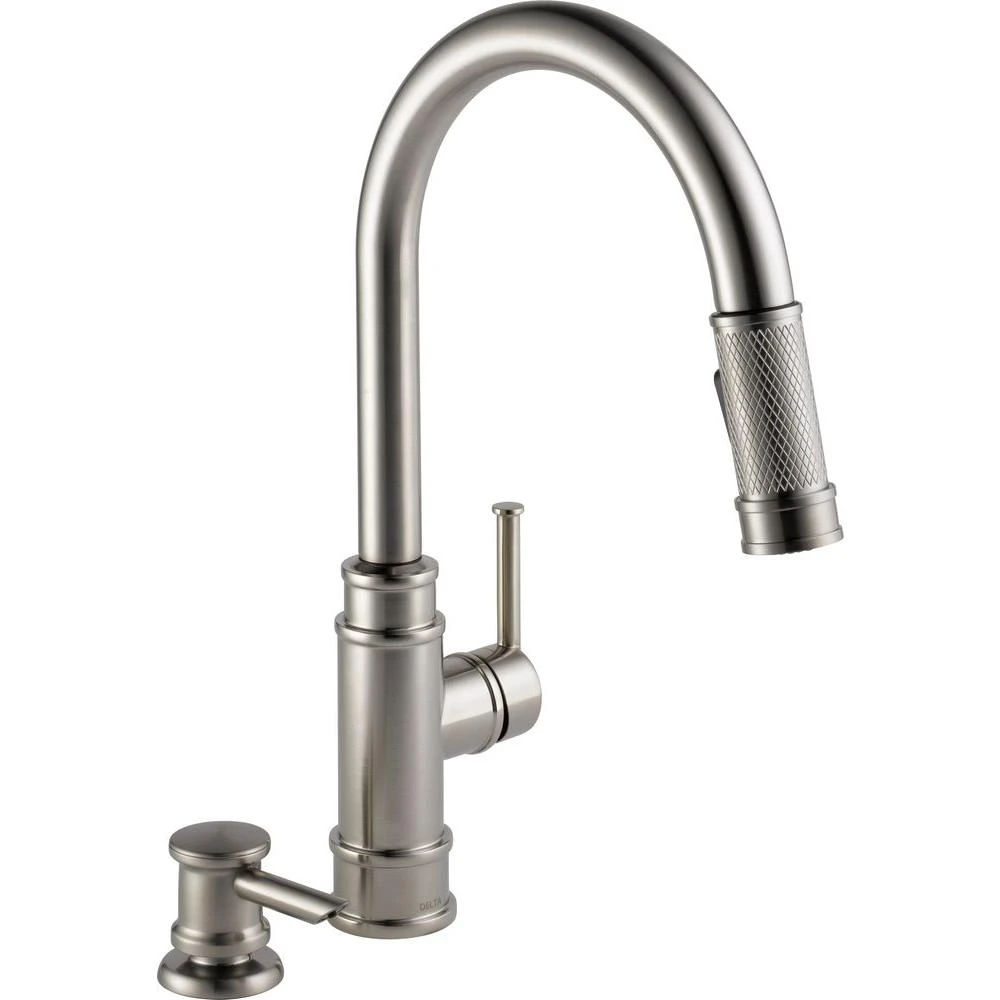 This Allentown Single-Handle Pull-Down Sprayer Kitchen Faucet with Soap in SpotShield Stainless beautifully combines aesthetics and technology. SpotShield Technology means less spots, less cleaning and antimicrobial protection of the finish. Unlike other pull-downs that tend to droop over time, MagnaTite docking keeps your Delta pull-down faucet looking picture-perfect. The pull-down spray wand comes free with a gentle tug and gives you total flexibility. The hose extends and retracts without friction points, fed by gravity. As you raise the wand to dock it, the magnet embedded in the spout pulls the wand precisely into place. Delta’s exclusive DIAMOND Seal Technology uses a valve with a tough diamond coating. InnoFlex PEX waterways keep water inside the faucet out of contact with potential metal contaminants.