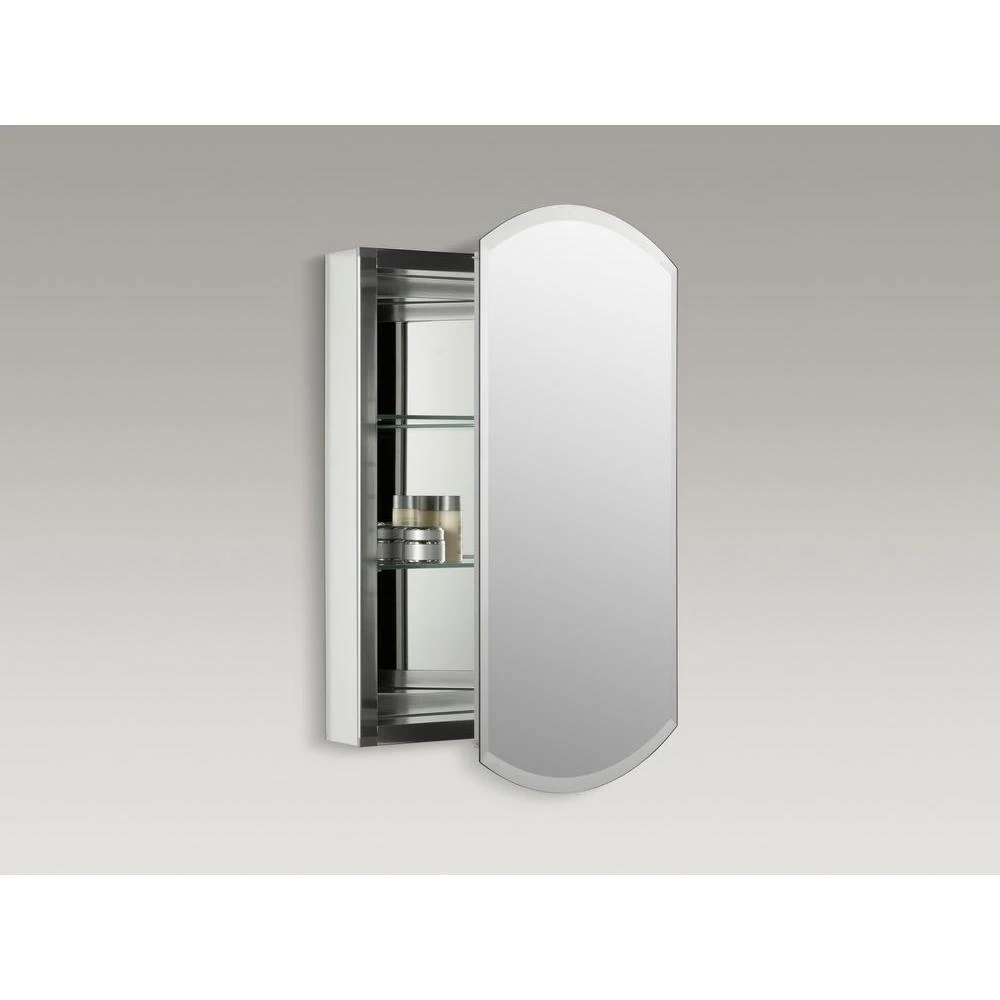 With its sleek anodized aluminum and glass construction, the Archer mirrored cabinet provides a stylish complement to your bath or powder room. Mirrors are positioned on the front and back of the door as well as the interior back wall of the cabinet. Two adjustable glass shelves hold your toiletries and bath items. Durable aluminum construction makes this cabinet rust- and rot-resistant.