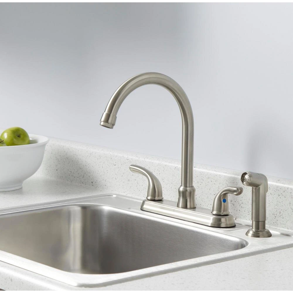 The Glacier Bay Builder 2-Handle Kitchen with sprayer in Stainless finish offers a convenient high arc spout for ease of use in the kitchen. The included a side sprayer makes cleaning the sink, washing vegetables, or filling containers quick and easy. Glacier Bay provides a Limited Lifetime Warranty.