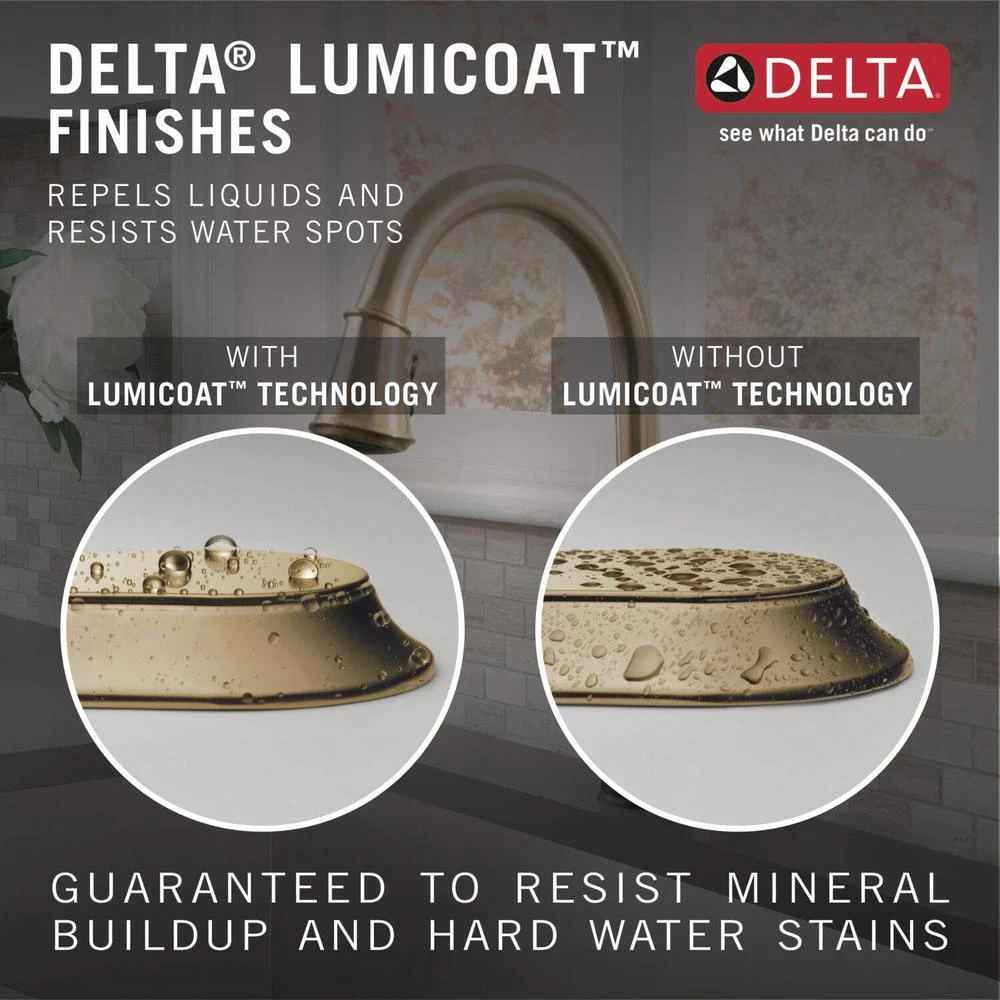 Whether you have two full hands or 10 messy fingers, Delta Touch2O Technology helps keep your kitchen faucet clean, even when your hands aren’t. A simple touch anywhere on the spout or handle with your wrist or forearm activates the flow of water at the temperature where your handle is set. The Delta TempSense LED light changes color to alert you to the water’s temperature and eliminates any possible surprises or discomfort. Kitchen sink faucets with Touch-Clean Spray Holes allow you to easily wipe away calcium and lime build-up with the touch of a finger. Delta ShieldSpray Technology cleans with laser-like precision while containing mess and splatter. A concentrated jet powers away stubborn messes while an innovative shield of water contains splatter and clears off the mess, so you can spend less time soaking, scrubbing and shirt swapping. Delta Lumicoat Finishes easily wipe clean without the need for cleaners or chemicals and are guaranteed to resist mineral buildup and hard water stains. The ultra-sleek surface repels liquids, resisting water spots and staying cleaner longer, so your faucet stays beautiful. Delta kitchen faucets with DIAMOND Seal Technology perform like new for life with a patented design which reduces leak points, is less hassle to install and lasts twice as long as the industry standard. Electronic parts are backed by our 5-year electronic parts warranty.