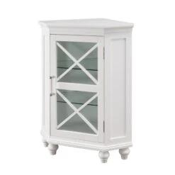 STYLISH CORNER CABINET: Features a white finish with a door that’s decorated with cross-shaped molding and an acrylic pull for a timeless addition to your space