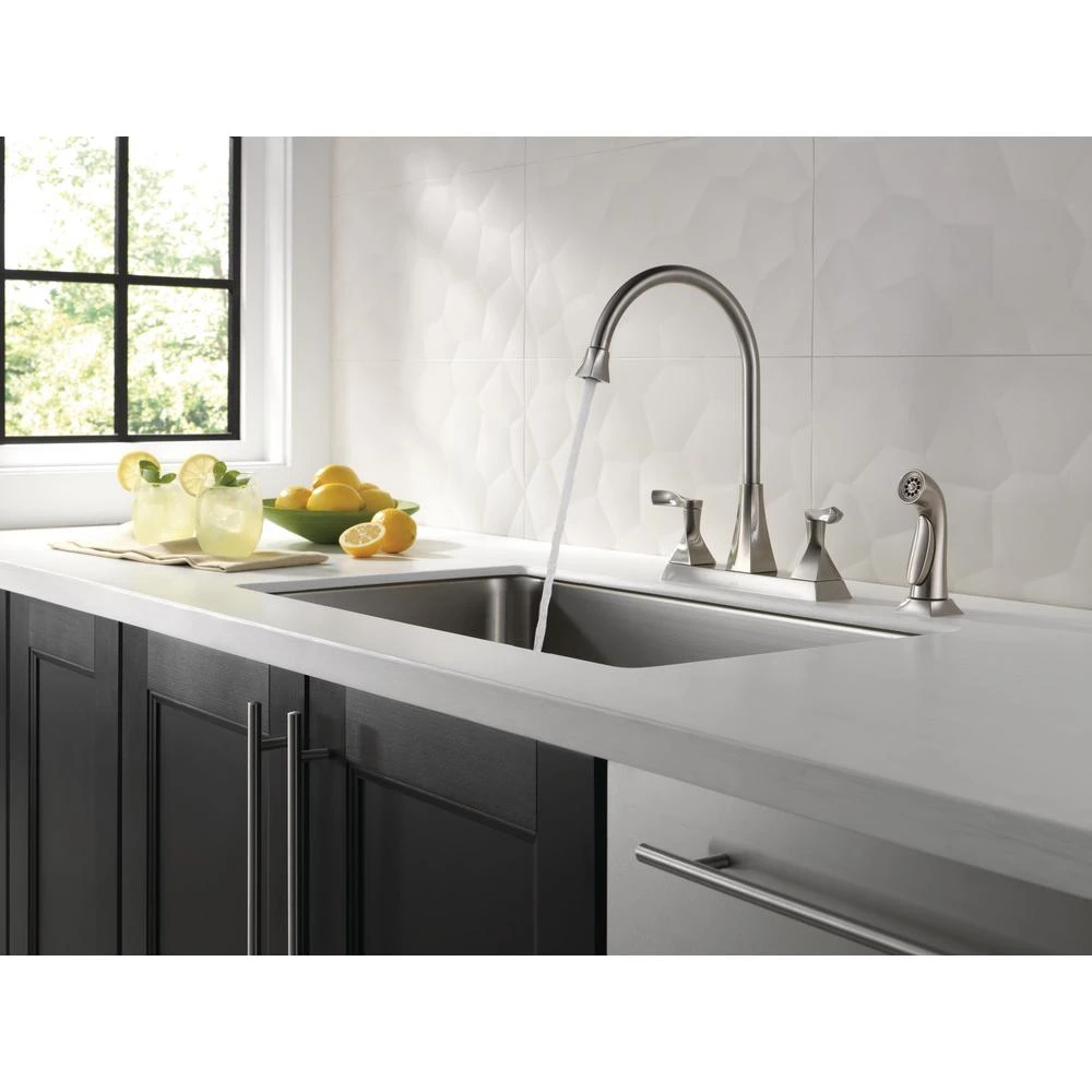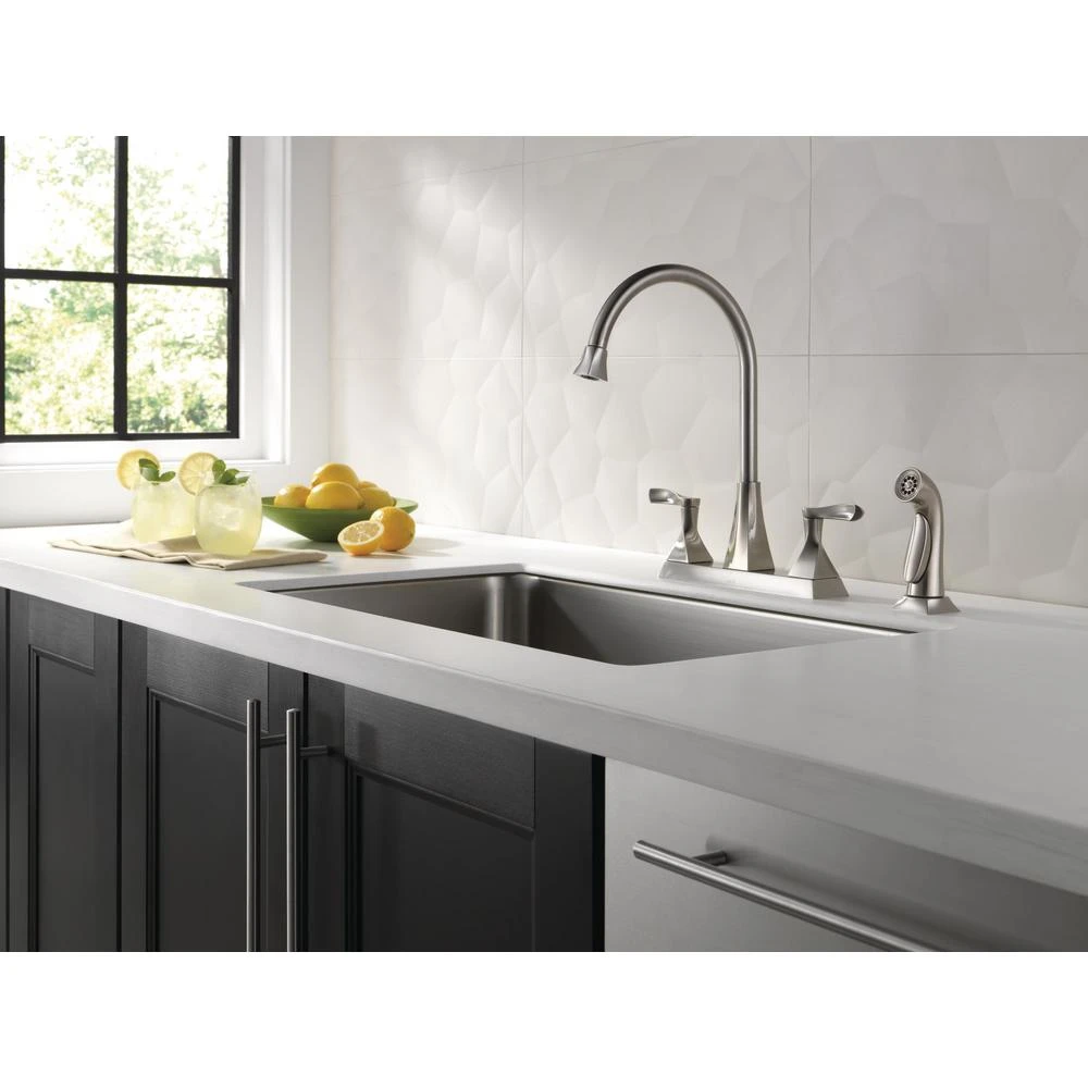 With defined edges and an elegant twist, the Everly Collection has a distinct silhouette to embellish your kitchen. This high-arc kitchen faucet provides exceptional spout reach, making easy work of filling pots and washing dishes. You can install with confidence, knowing that Delta faucets are backed by our Lifetime Limited Warranty.