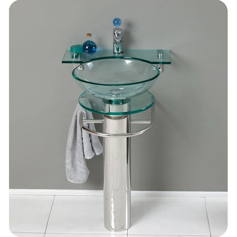 - Pedestal vanity, countertop, sink, faucet, mirror, shelf, p-trap, pop-up drain and installation hardware included