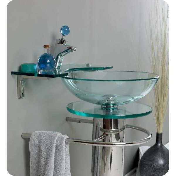 This simply constructed jewel tone chrome stand and gently sloping tall clear glass basin are ideal for simple living with a touch of class and modern charm. Versatile for any decor. Quietly interesting and chic without being disruptive.