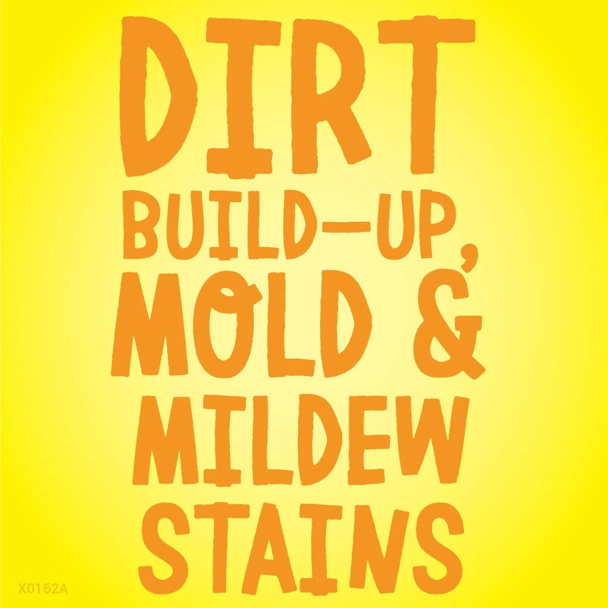 - Works on dirt buildup, mold stains, mildew stains, soap scum and hard water stains.