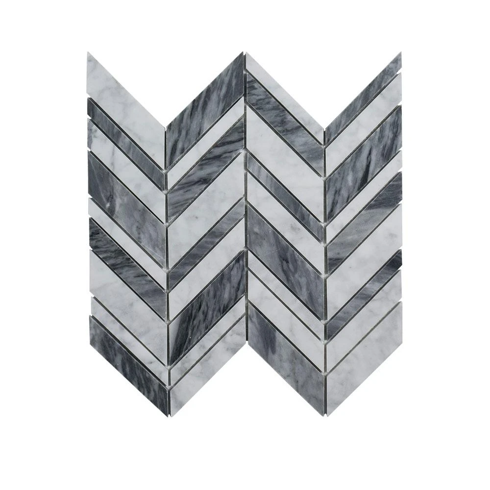 Give your room a quiet confidence with the Carlton 11.25 in. x 12 in. Marble Mosaic Tile. The white and gray marbles come in a honed and polished finish, respectively, and arranged in a beautiful chevron pattern that adds a brilliant look to any space. It’s the perfect tile for adding or completely renovating floors, kitchen and bathroom backsplashes, and most other designs and installations.