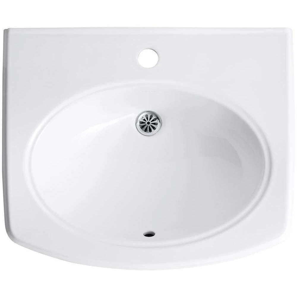 The KOHLER Pinoir Wall-Mount Bathroom Sink in White offers integrated styling with band-box lines and simple double-ridge edge detailing and is made of vitreous china for long-lasting beauty and durability. This model features a single-hole faucet drilling and must be completed with the Pinoir shroud.