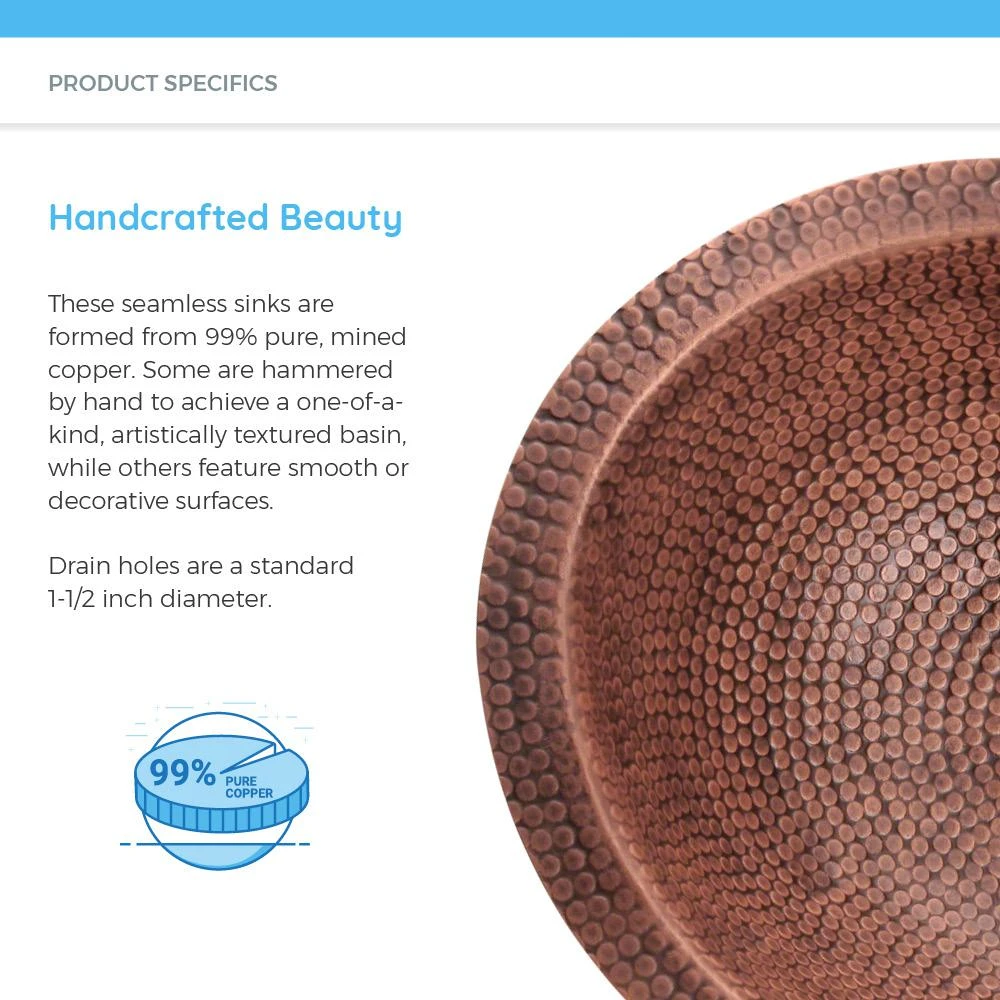 It’s like taking a step back in time to the baths of the ancients when the MR Direct 910 copper sink is on display. This distinctive oval bowl is crafted by the hands of fine artisans. Its attractive hammered finish provides a mask for small scratches which could occur over time. The 910 has the option of being mounted over or under the countertop. It is constructed from a single piece of 99% pure mined copper; and its appearance will change over time as oxidation slowly produces a surface coating known as a patina. This effect is usually a major incentive for purchasing a copper sink, therefore MR Direct does not use any lacquers or waxes which could temporarily retard it. With an overall measurement of 19 in. x 15-3/4 in. x 6 in., it will require a minimum-width cabinet of 21 in. Additionally, a grid drain (gd) is included, which allows water to pass through while catching solid debris with its attractive antique bronze cap.
