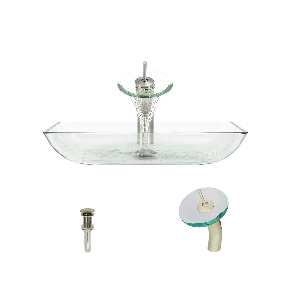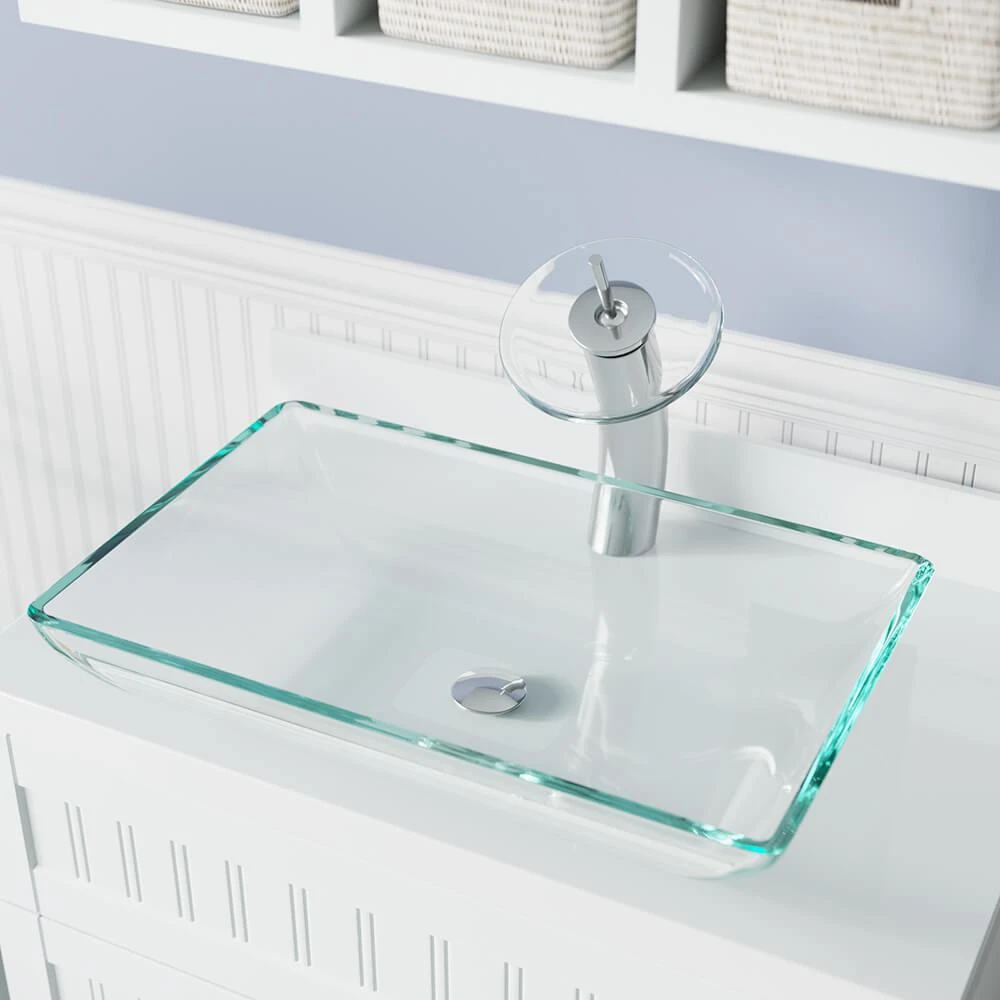 The MR Direct 640 ensemble is a distinctive pairing of a vessel-sink and vessel-faucet. All MR Direct glass vessel sinks are created of thick, tempered glass, making them less vulnerable to damage from high temperatures. Their non-porous, polished surface is extremely attractive and sanitary – naturally resistant to stains, odors, and discoloration. This model features clear glass and is rectangular in shape with a broad flat bottom and sides arching upwards in a 45° curve. In addition to the waterfall faucet, this ensemble includes a specially-designed, pop-up drain which springs into place with a gentle touch and matches the chrome finish of the faucet.