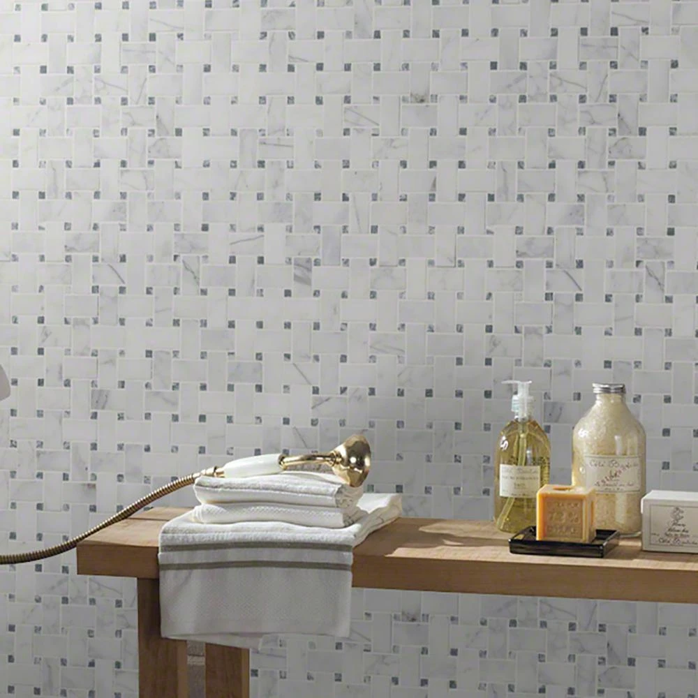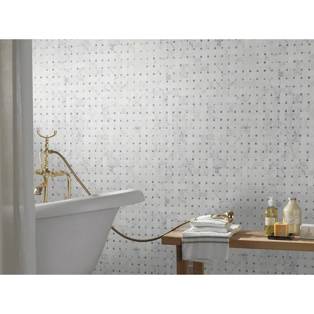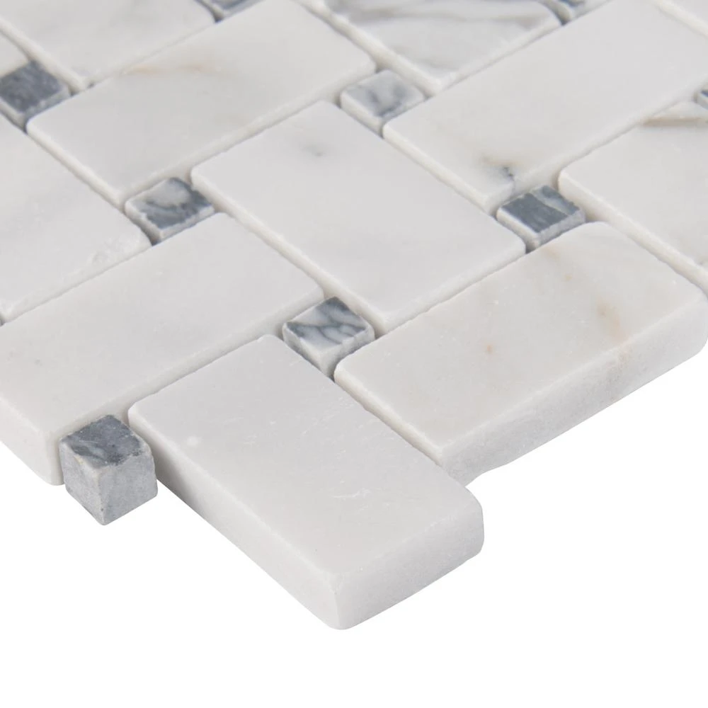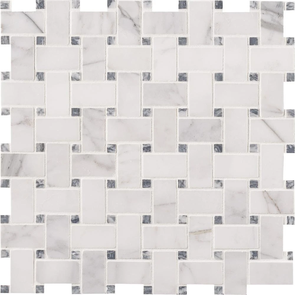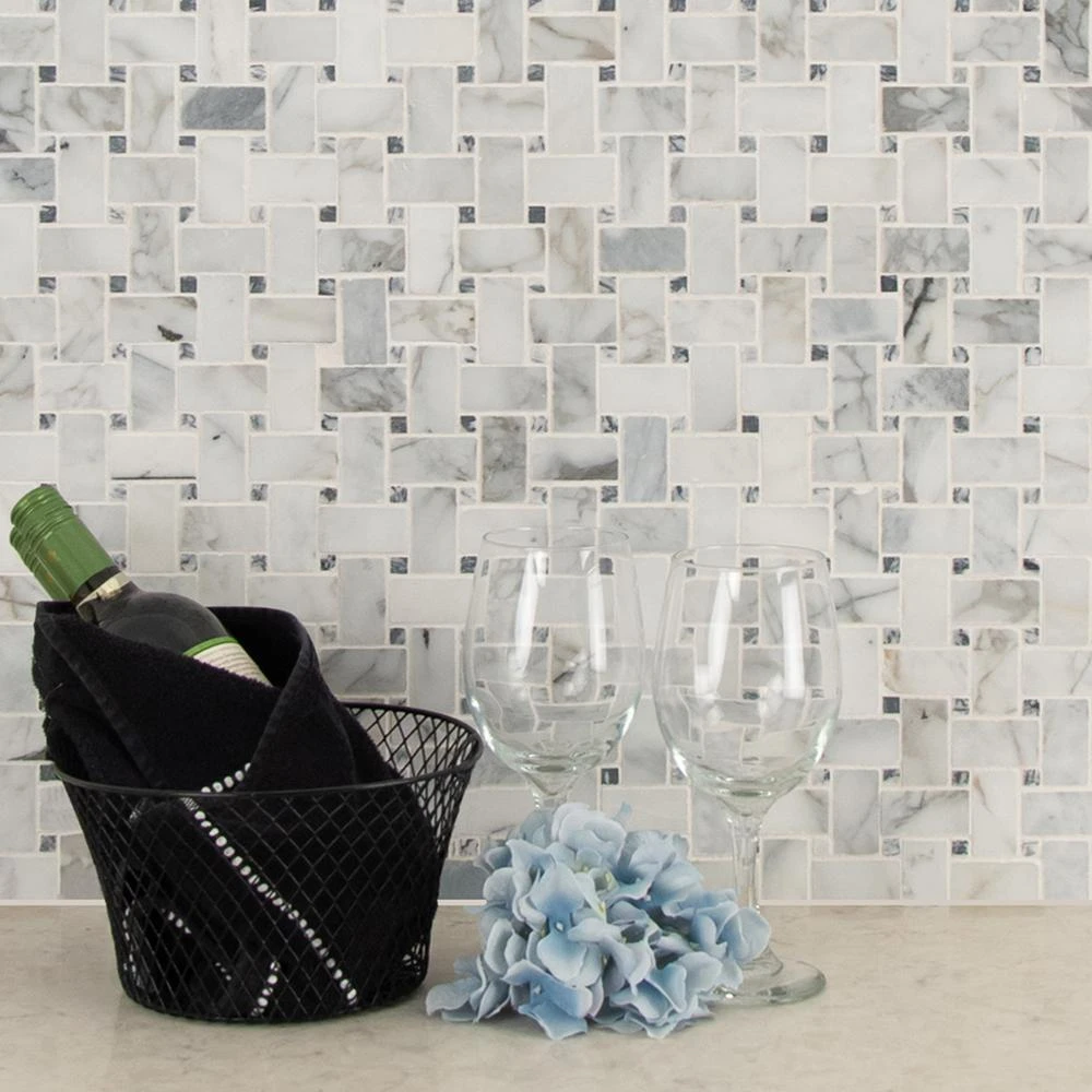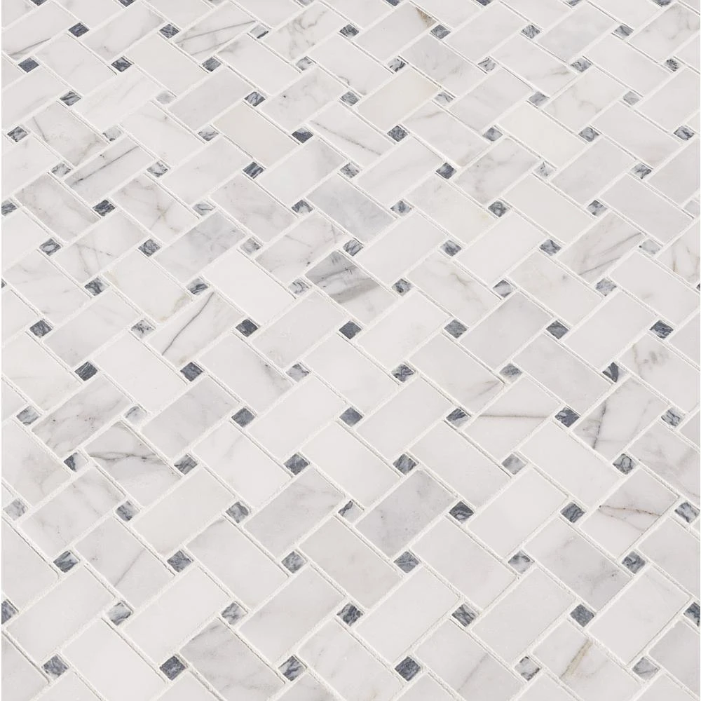 Accentuate your home with the elegance of this MSI Calacatta Cressa Basket-weave Honed Mosaic Tile. Featuring basket weave pieces of white and gray porcelain, it adds visual interest to any interior or exterior space. These mesh-backed tiles are easy to install and maintain and give you a designer look at an affordable price. The perfect choice for updating your kitchen backsplash, bath wall, countertop surface or feature wall. Designed for both residential and commercial use. Natural stone products are naturally subject to variations in color, shade, finish, etc. It is recommended to blend tiles from different boxes when installing. Natural stones may be characterized by dry seams and filled pits. The filling can work its way out and refilling these areas may be needed as part of a normal maintenance procedure. Seal all natural stone products with a penetrating sealer. Note: Inspect all tiles before installation. Natural stone products inherently lack uniformity and are subject to variation in color, shade, finish etc. It is recommended to blend tiles from different boxes when installing. Natural stones may be characterized by dry seams and pits that are often filled. The filling can work its way out and it may be necessary to refill these voids as part of a normal maintenance procedure. All natural stone products should be sealed with a penetrating sealer