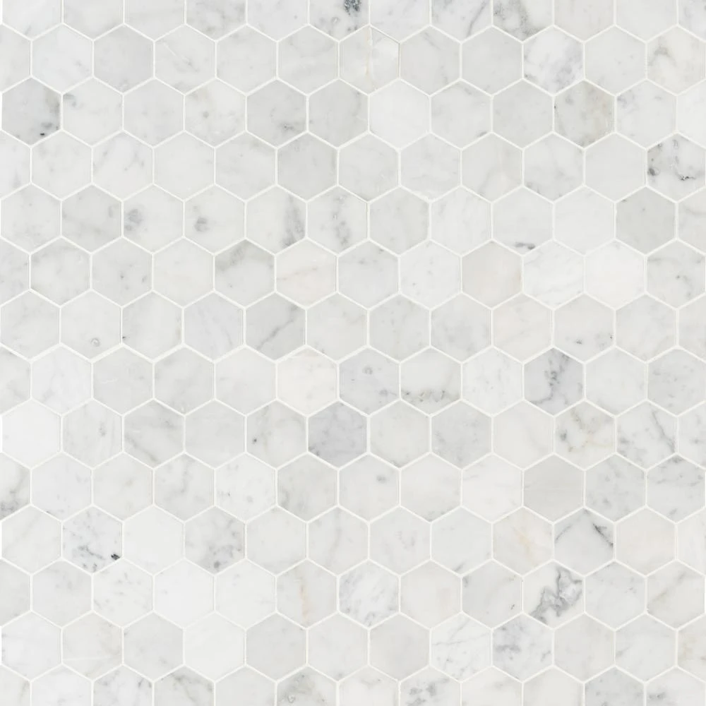Use the Carrara White Hexagon Honed Marble Mosaic Wall Tile for your next installation or renovation project to incorporate a contemporary aesthetic into your decor. This attractive tile features 2 in. hexagonal-pieces on a 11.75 in. x 12 in. mesh sheet that makes installation a much easier process. A smart blend of elegant white tones create a stylish complement for a wide variety of design schemes. This tile is constructed from durable marble material and is ideal for a variety of wall or floor applications. Note: Inspect all tiles before installation. Natural stone products inherently lack uniformity and are subject to variation in color, shade, finish etc. It is recommended to blend tiles from different boxes when installing. Natural stones may be characterized by dry seams and pits that are often filled. The filling can work its way out and it may be necessary to refill these voids as part of a normal maintenance procedure. All natural stone products should be sealed with a penetrating sealer.