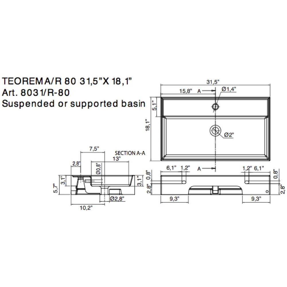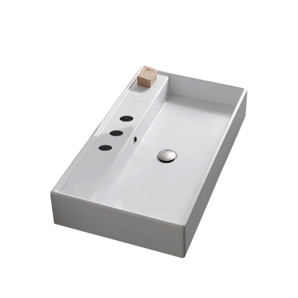 This sleek contemporary style white ceramic sink in Italy. Available as a wall-hung sink or as an over the counter bath sink. Three hole model is available in this ADA compliant sink.