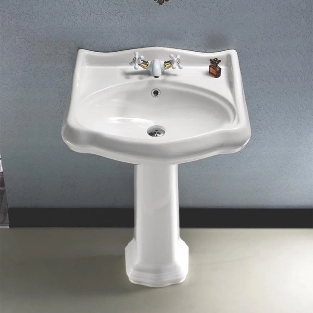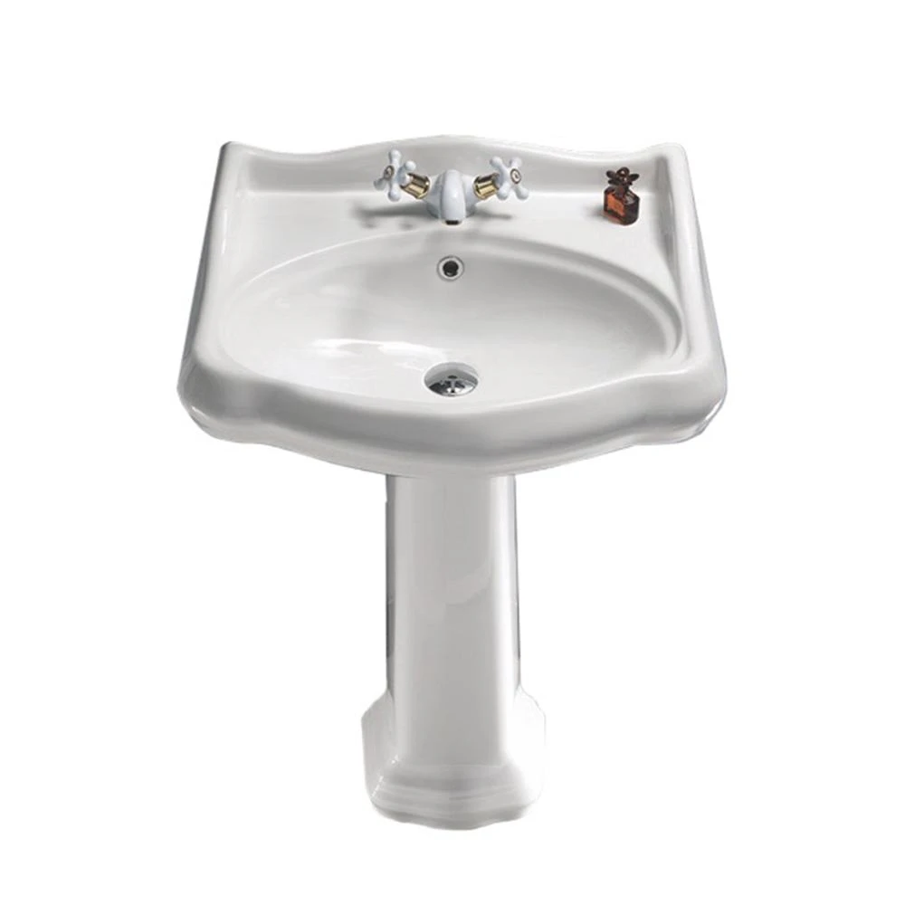Traditional 24 in. W rectangular pedestal sink. Available in 1 or 3 faucet whole options, this sink is perfect for traditional bathrooms. Sink is made of ceramic and includes an overflow. Made and designed by high-end and well known Turkish brand CeraStyle.