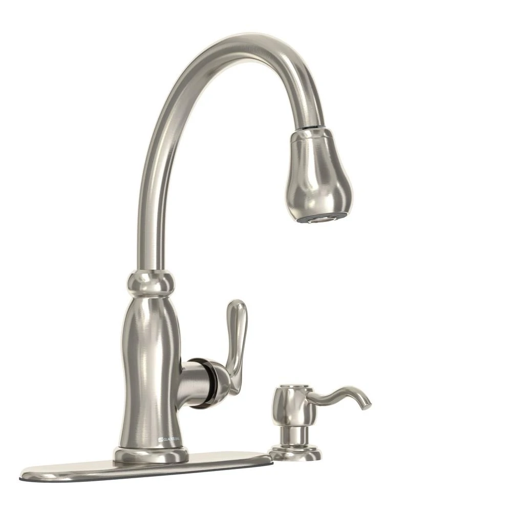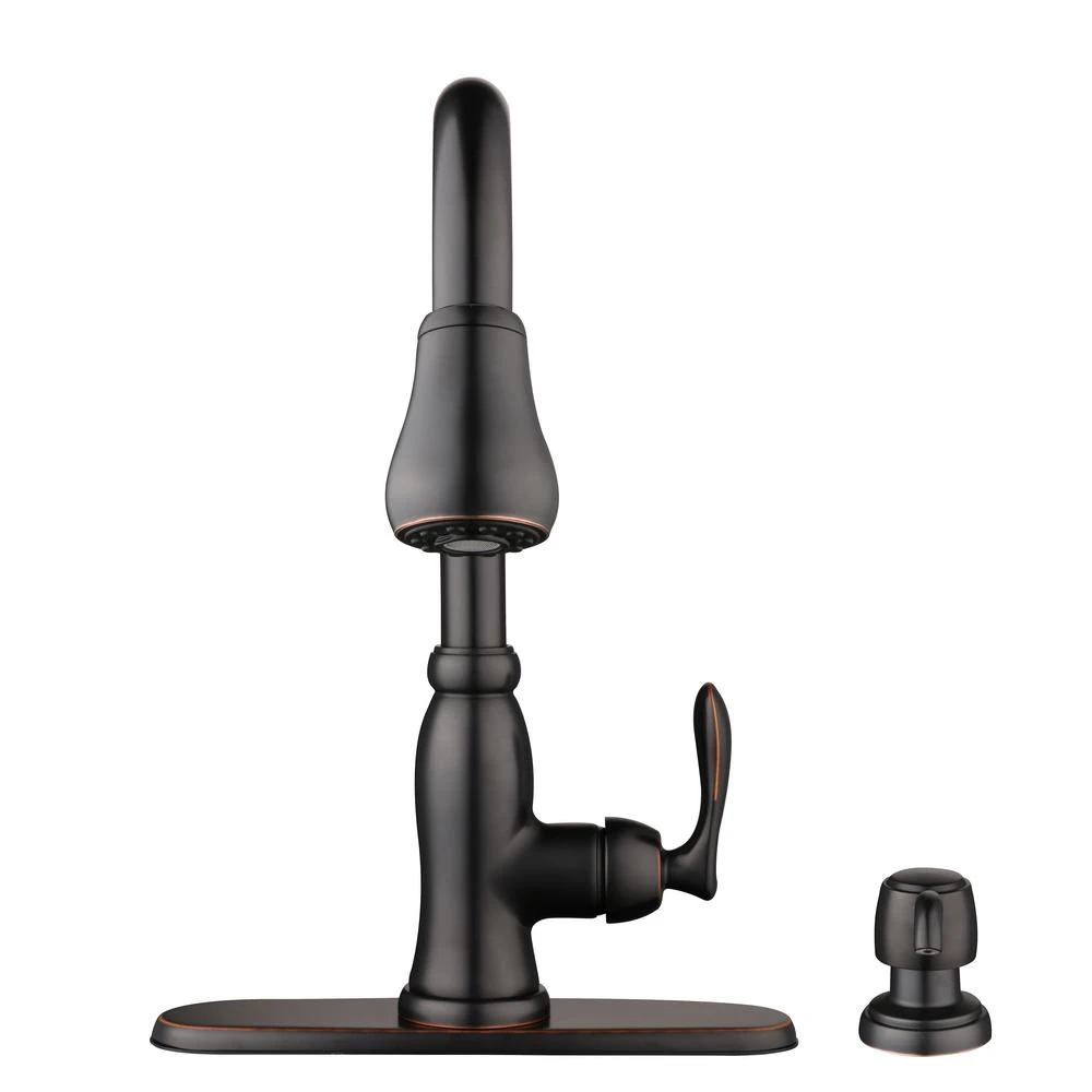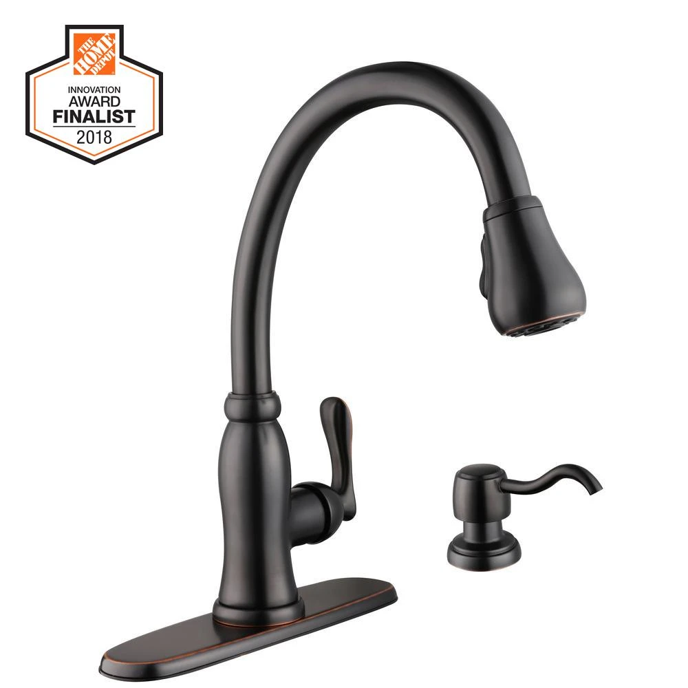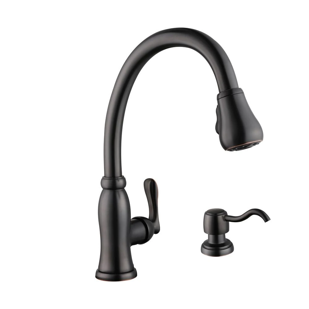 The Glacier Bay Pavilion Single-Handle Pull-Down Sprayer Kitchen Faucet with Soap Dispenser in Bronze has a sleek design to coordinate with a wide variety of kitchen decorating styles. Featuring TurboSpray which provides a stronger spray force than your standard pull-down sprayer. The pull-down spray head offers versatility for both a TurboSpray and aerated spray for completing various washing tasks with efficiency, while the single-handle design makes water control quick and easy. This faucet also includes the Glacier Bay exclusive FastMount installation system to help make installation quicker and easier. For added convenience, it comes with a handy soap/lotion dispenser.