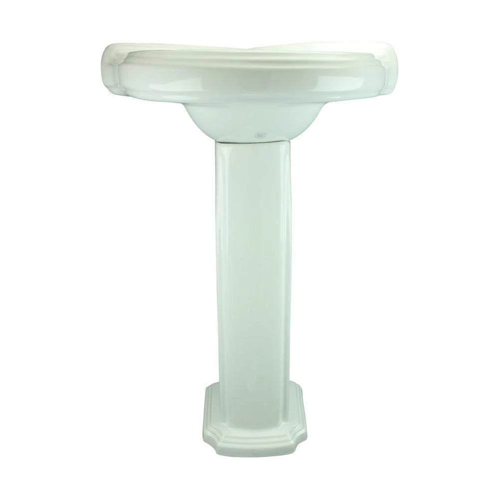 The Portsmouth white pedestal sink from Renovator’s Supply features durable ceramic construction and a tasteful traditional design. The pedestal is decorative and squared at the top where it rests under the sink basin. We specifically designed the pedestal this way so that if a ring or other object were to fall down the drain the pedestal can easily be removed. If desired Caulking can be applied to the gap as well. Pick out your Corner Sink here today. Item ID 19358. Features The Portsmouth is a beautiful reproduction pedestal basin sink. Open-back white pedestal sinks save space in your bathroom and make installation a breeze. Constructed from gorgeous Porcelain for durability and easy cleanup. Reno-Gloss finish protects from scratches and stains. Overflow hole, self-draining soap dishes and backsplash keep water under control. Authentic Renovator’s Supply logo guarantees better quality than the knockoffs. Hardware Accepts a 4 in. centerset faucet (not included). 1-5/8 in. drain hole (not included). What’s Includes One (1) Portsmouth Porcelain white Pedestal Sink with Wall Mounting Bracket.