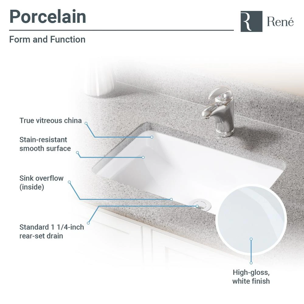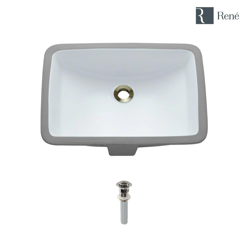 This attractive, white, porcelain basin is designed to be mounted under the counter in a flush, positive, or negative reveal. Wide and narrow, its vitreous china finish glistens with charm and durability. The R2-1002-W is constructed of solid porcelain but with a special additional enamel added at the end of its firing, turning it into a hardened, true, vitreous china. On its own, porcelain is both beautiful and durable, but the additional vitreous china coating creates an even more impervious and sanitary surface. It measures 20-3/4 in. x 14-3/4 in. x 7-3/4 in. 20-3/4 in. x 14-3/4 in. x 7-3/4 in., with an offset drain and overflow. With a simple press to its handsome, brushed nickel dome; the included, spring-loaded, pop-up drain (pud) can be opened or closed.