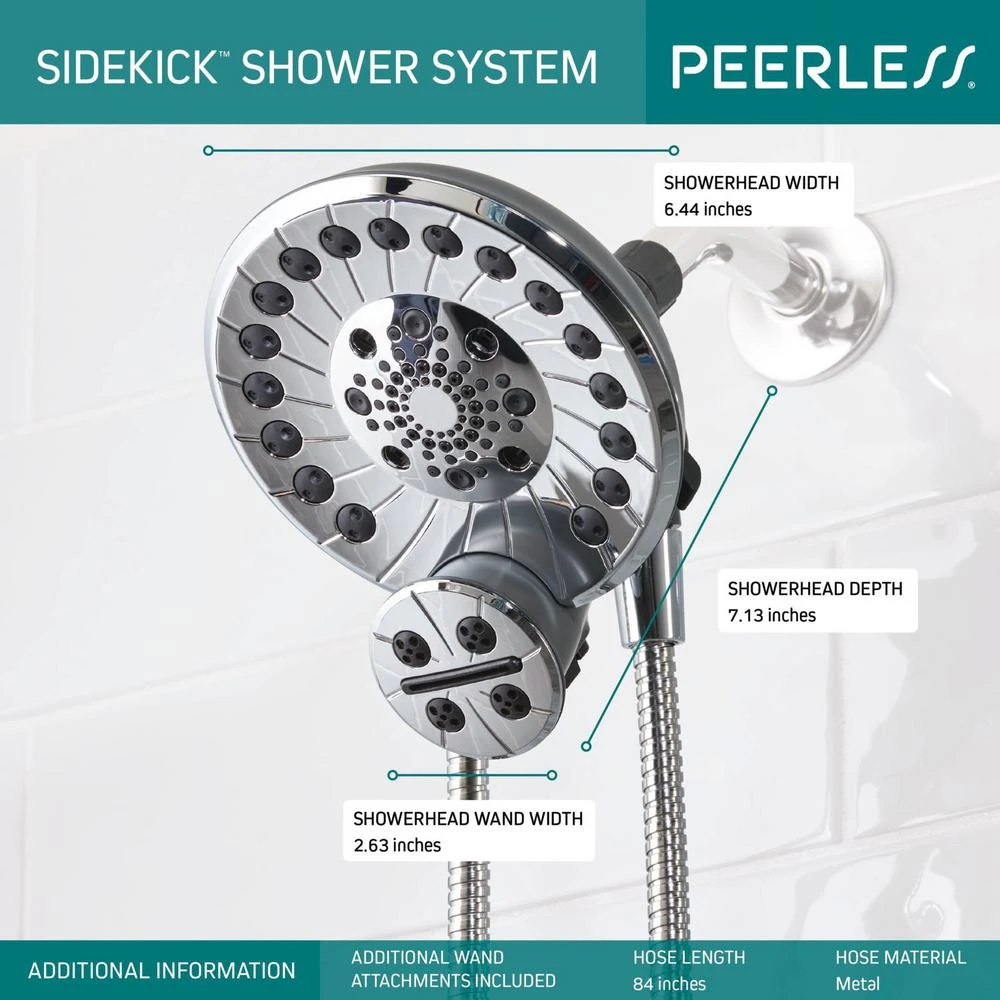 The multipurpose Peerless SideKick Shower System installs on the existing shower arm with no special tools needed. The shower head with water-amplifying spray gives you a drenching experience. The convenient shower wand makes your daily life simple with included attachment for bathing kids and available attachments for pets and cleaning tubs and tile (sold separately). A smart suction-cup solution offers you the ability to place the hand-held wand wherever you need it and angle the spray at a lower level for bathing pets or children. Quickly re-dock the wand while sitting or kneeling outside of the tub, keeping it out of dirty water.