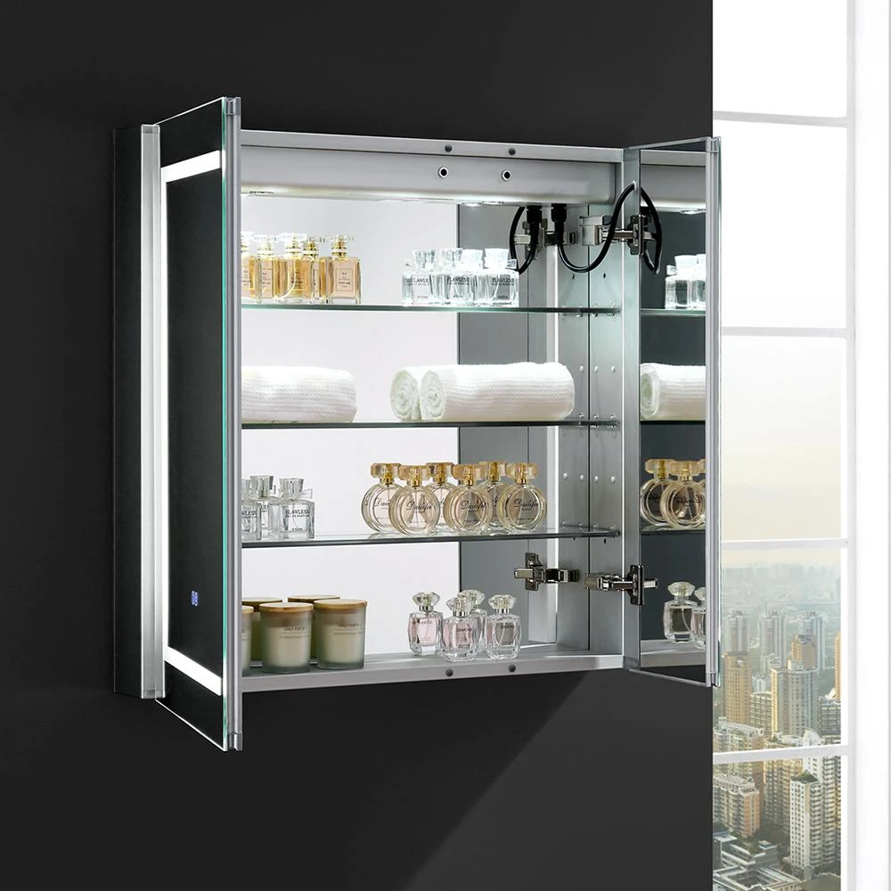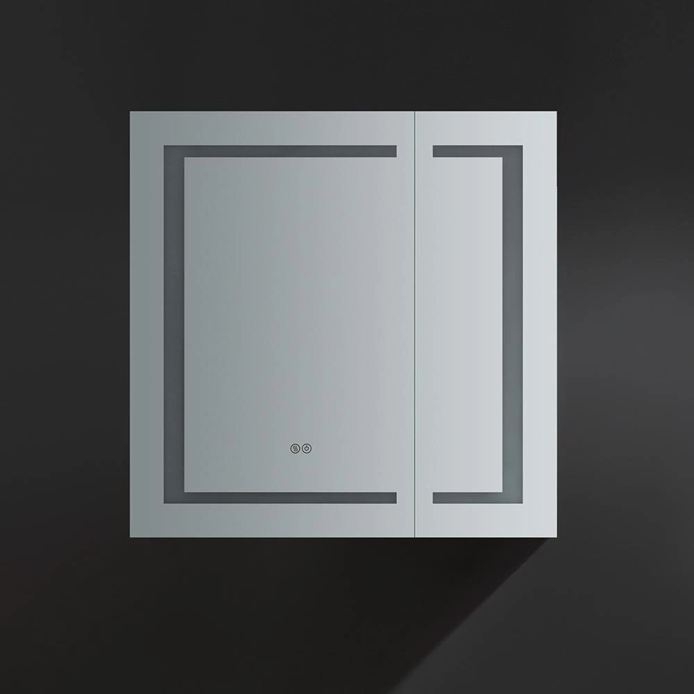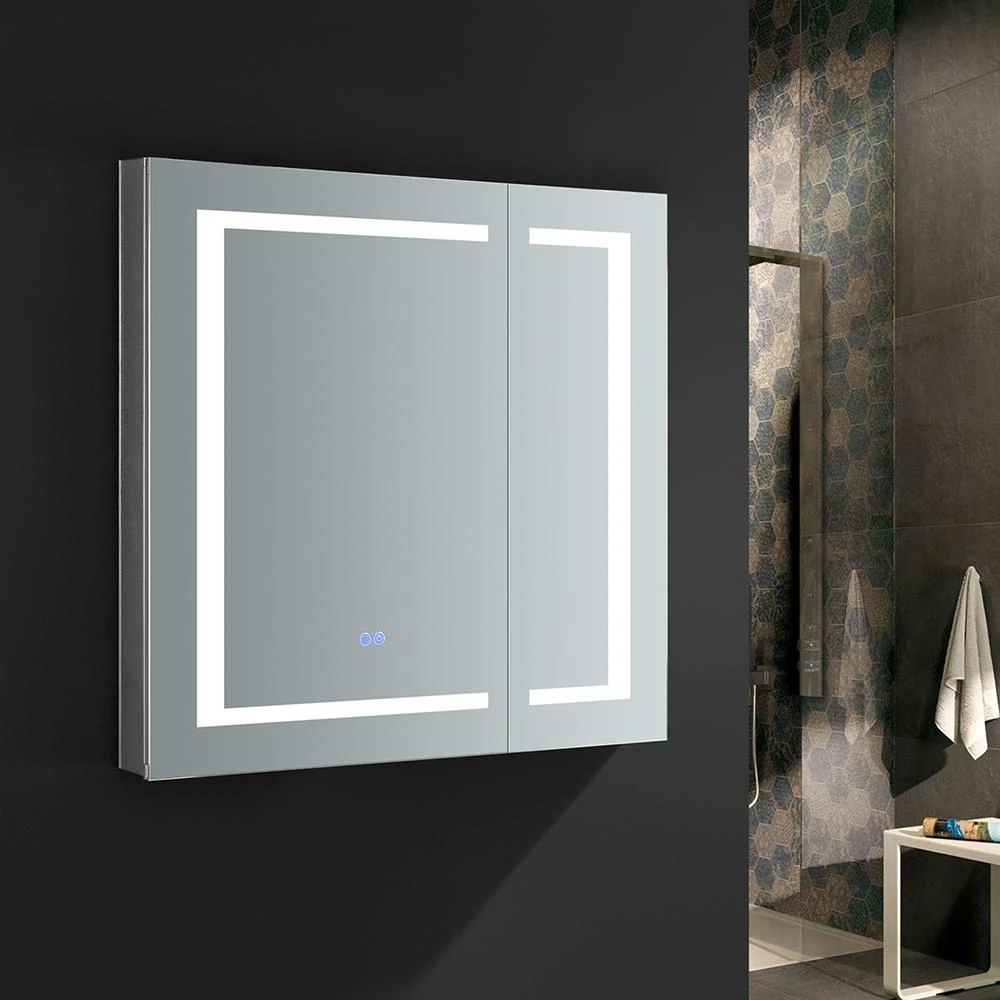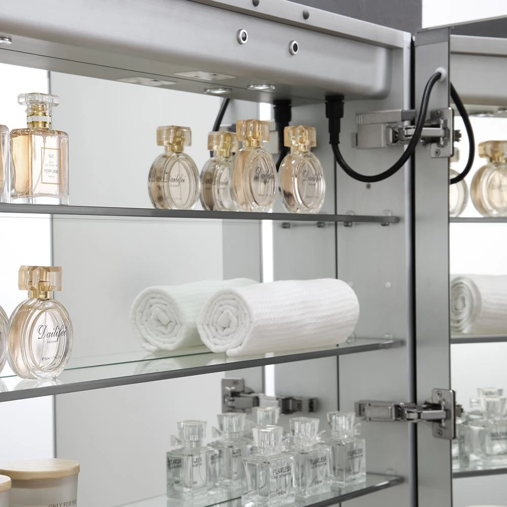 The Fresca Bathroom Medicine Cabinet comes with everything you need to create an elegant and modern bathroom, with every convenience right in front of you. On the outside, its a sophisticated mirrored medicine cabinet with a built-in dimmable surface LED task light which creates an illuminated frame within the mirror. It also has a defogger feature. Inside, there’s an LED light and a handy electrical/USB outlet combo for an electric shaver, toothbrush or other essentials. The interior features 3 adjustable glass shelves and a mirrored back wall. The double-sided mirrored doors swing 170°s on soft-close BLUM hinges. Measuring 30 in. W x 30 in. H x 5 in. D, this medicine cabinet is available in several sizes.