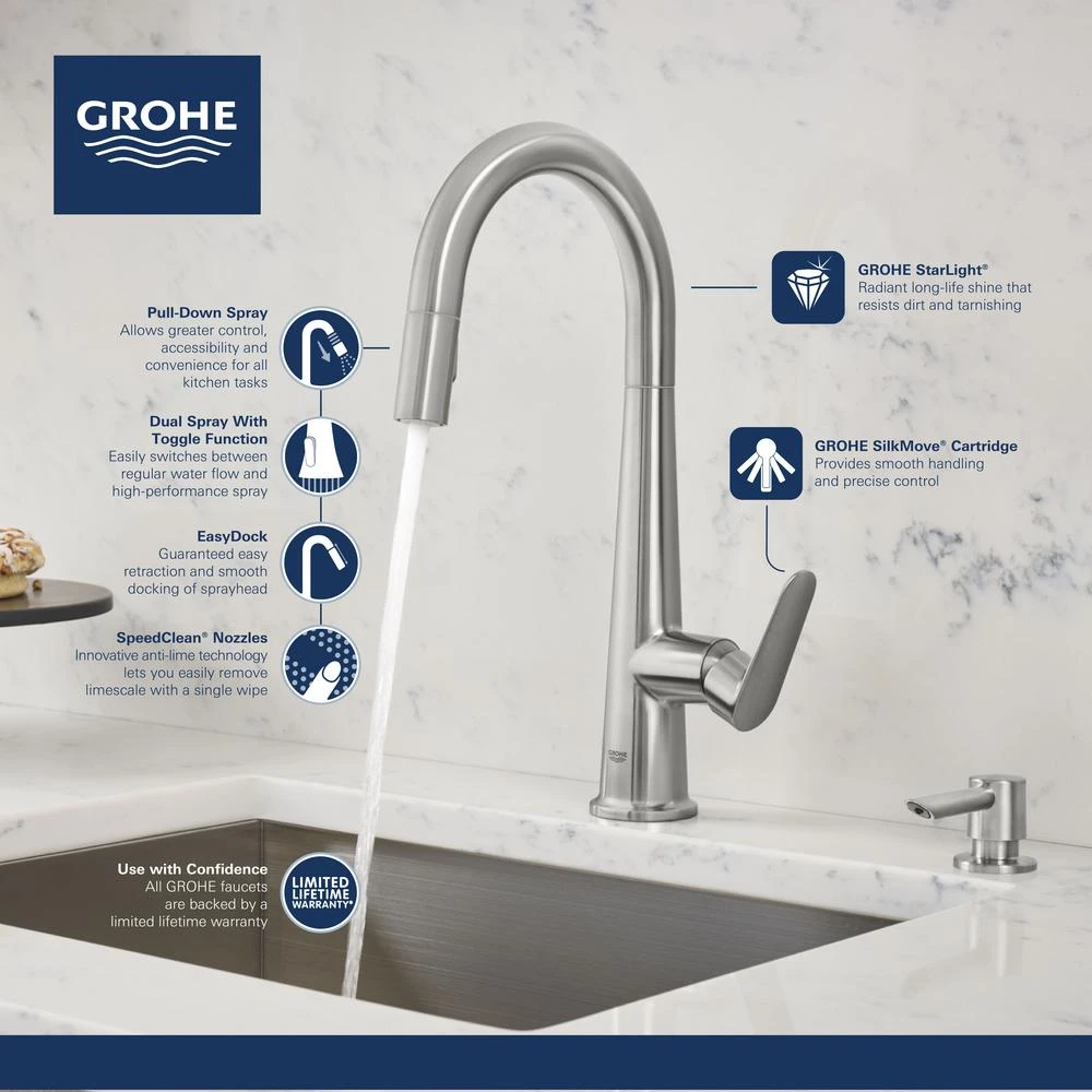 - Includes GROHE SilkMove cartridge, which delivers smooth, effortless control of the water flow and temperature and a lifetime of maintenance-free operation
