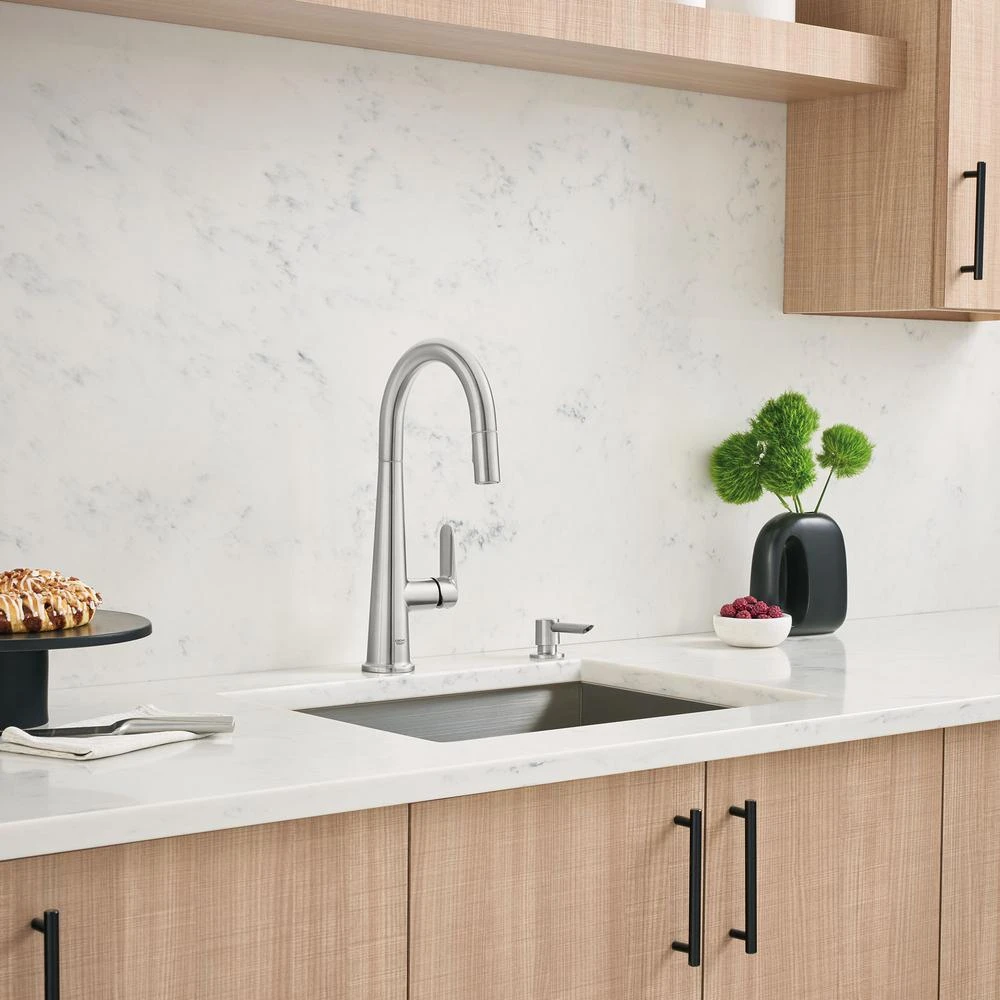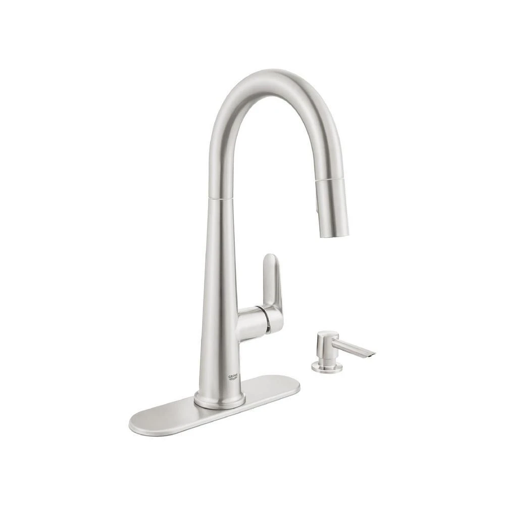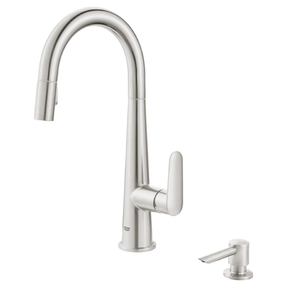 Sleek, elegant and unabashedly minimalist, the GROHE Veletto pull-down faucet with soap dispenser in Chrome cuts a dramatic figure in any modern or transitional-style kitchen. As functional as it is visually striking, the faucet offers smooth, precise control of the water temperature and volume, thanks to a side lever handle equipped with a GROHE SilkMove cartridge, and a gooseneck swivel spout with 360° rotation. The spout incorporates a pull-down spray head featuring 2-spray functions stream and spray and GROHE SpeedClean nozzles that resist lime scale buildup. The GROHE StarLight Chrome finish will neither tarnish nor scratch, retaining its brilliance through a lifetime of use.