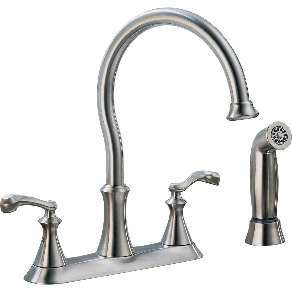 The Delta Vessona 2-Handle Kitchen Faucet in Stainless has soft, flowing curves to the spout and handles for an elegant look. It features a high-arc spout to make filling large pots quick and easy. It also has a side-mount sprayer with an 8 in. reach to make washing dishes and cleaning up the sink area more convenient.