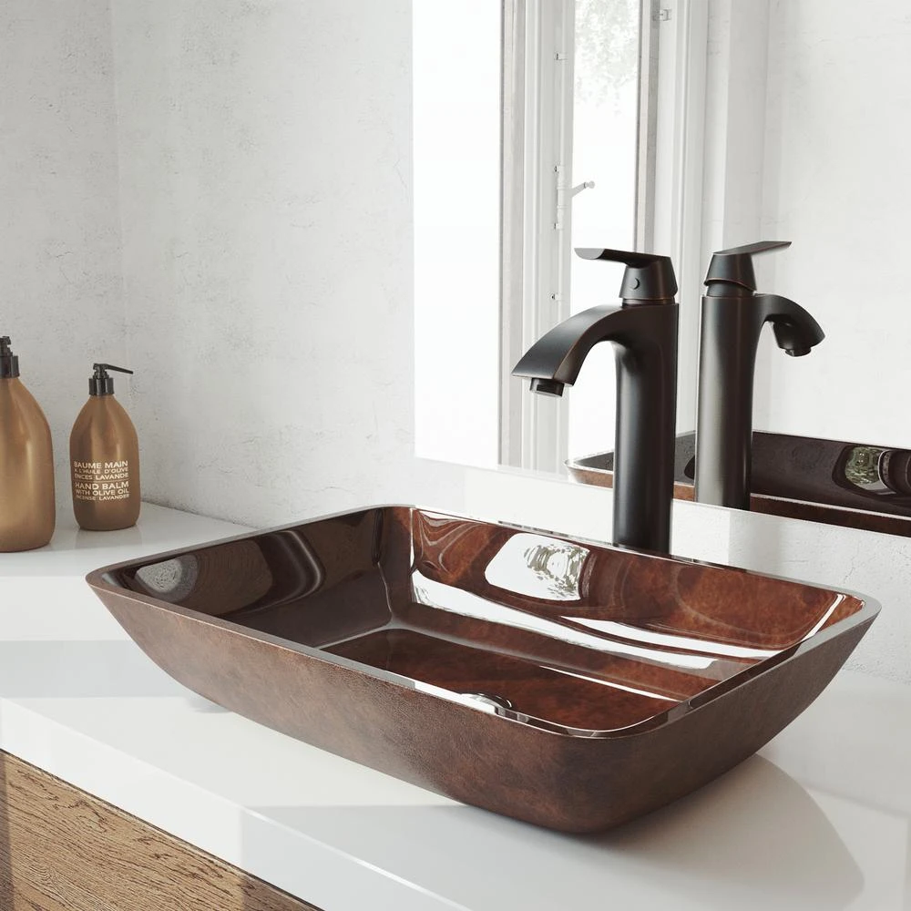 Rich in shape and design, the VIGO Rectangular Russet Glass Vessel Bathroom Sink Set With Linus Vessel Faucet is an excellent way to transform your bathroom from dated to new. The sink is made of durable tempered glass, keeping it shard-resistant for years of use. The complementary Linus Vessel faucet is outfitted in a 7-layer coated finish for durability and long-lasting style. The finishing touch is a matching pop-up drain, installed directly inside the vessel sink.