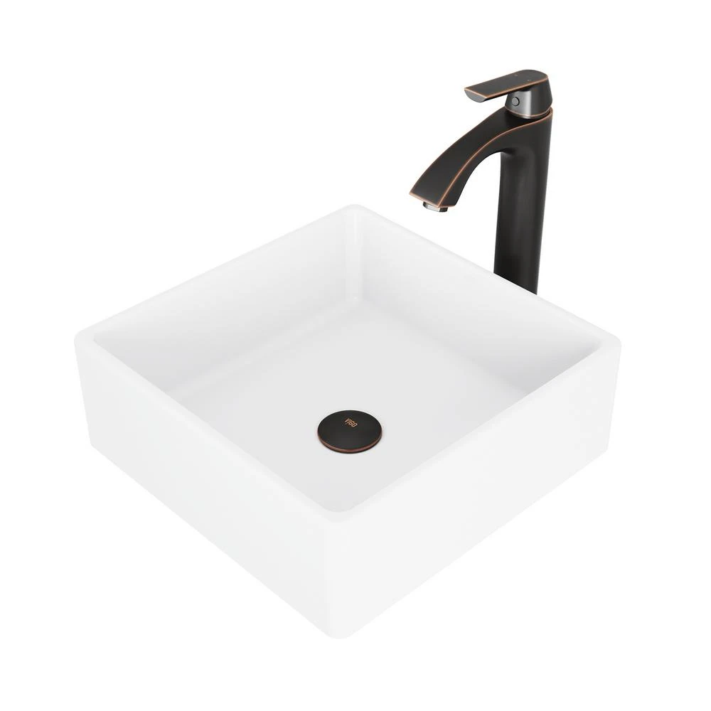The VIGO Dianthus Matte Stone Vessel Bathroom Sink Set with the Linus Vessel Faucet is a visual representation of the artistic regeneration. A sizable sink, the Dianthus is made of non-porous Matte Stone composite, rendering it resilient to scratches, stains and general impact. The sink is paired with the Linus Vessel Faucet which features a curved spout to add dimension to an already impressive setup. A complementary pop-up drain completes this one-of-a-kind set.