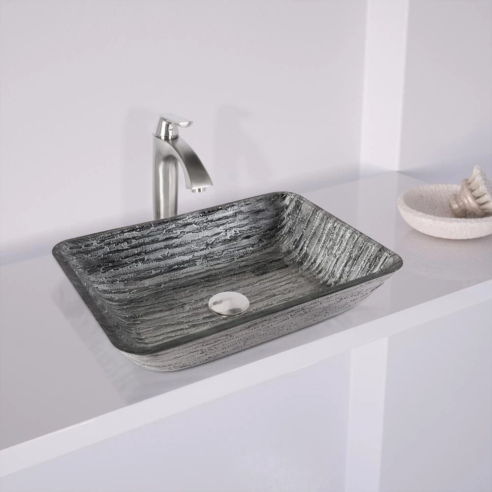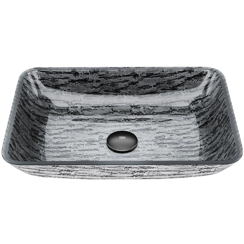 Handcrafted from durable tempered glass, the VIGO Rectangular Titanium Glass Vessel Bathroom Sink is ideal for everyday use. The polished interior and textured exterior are stain-resistant and easy to clean. The sleek angular shape makes this bathroom sink unique, while its organic pattern of silver and black lines add a real “wow” factor to make this sink a perfect addition to any modern bathroom.