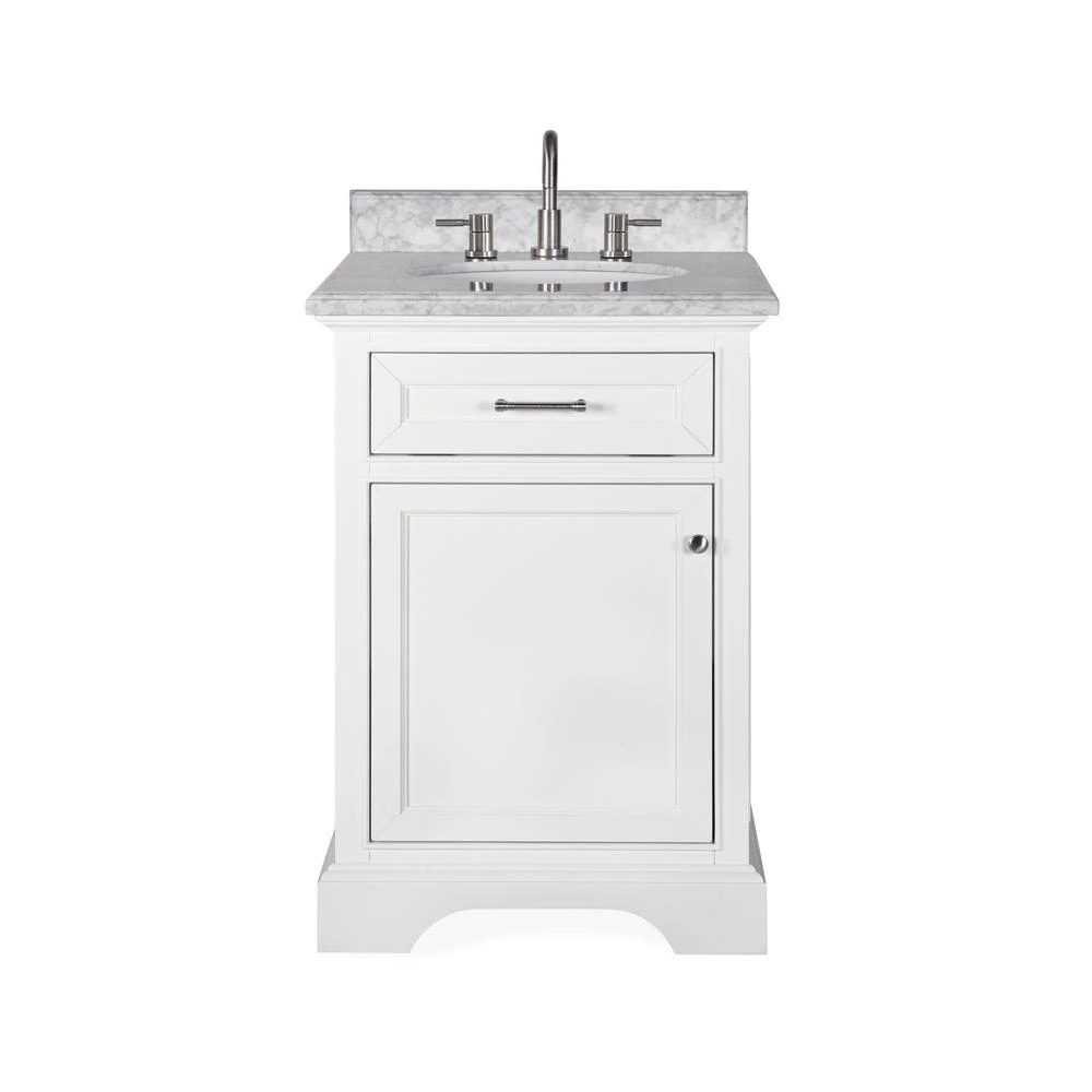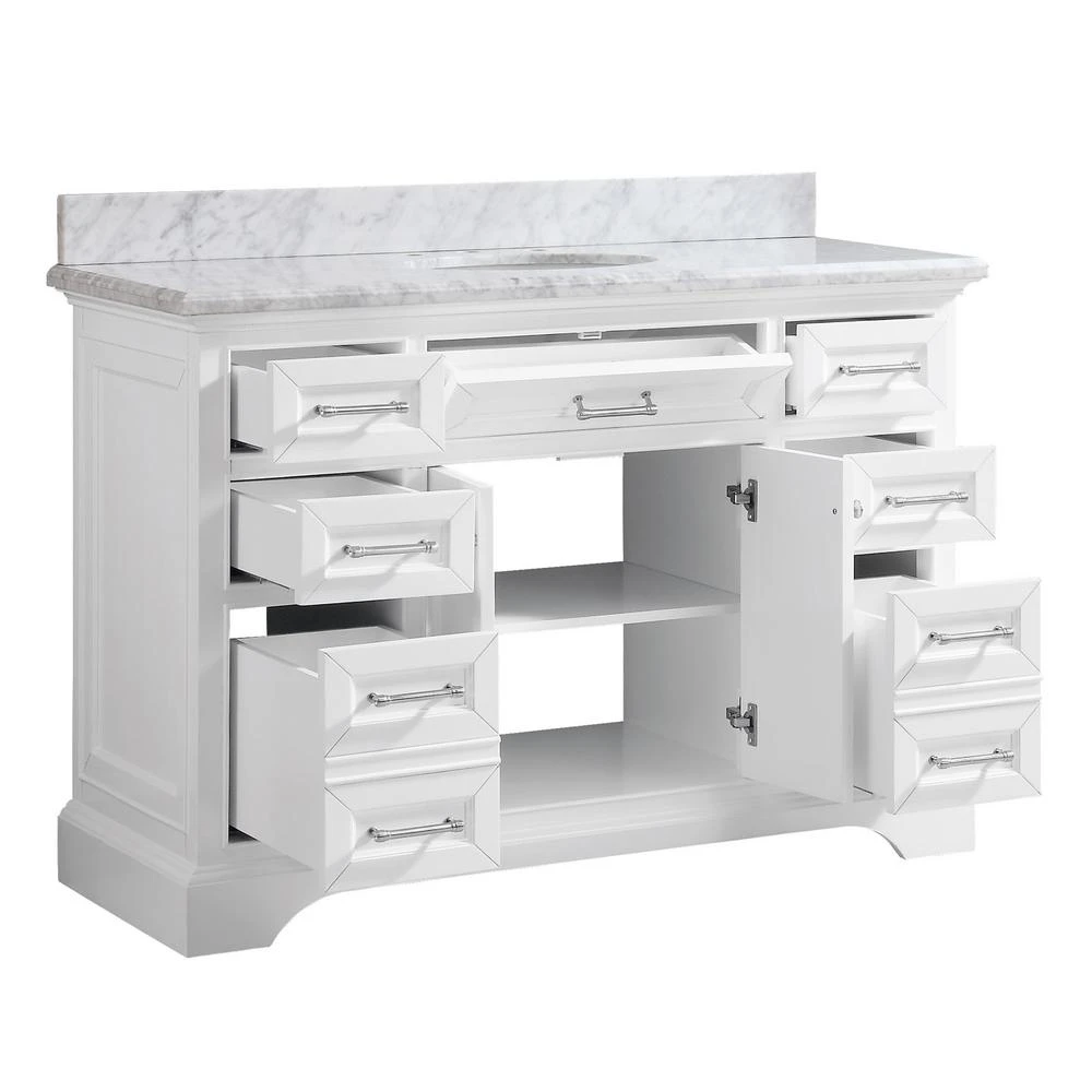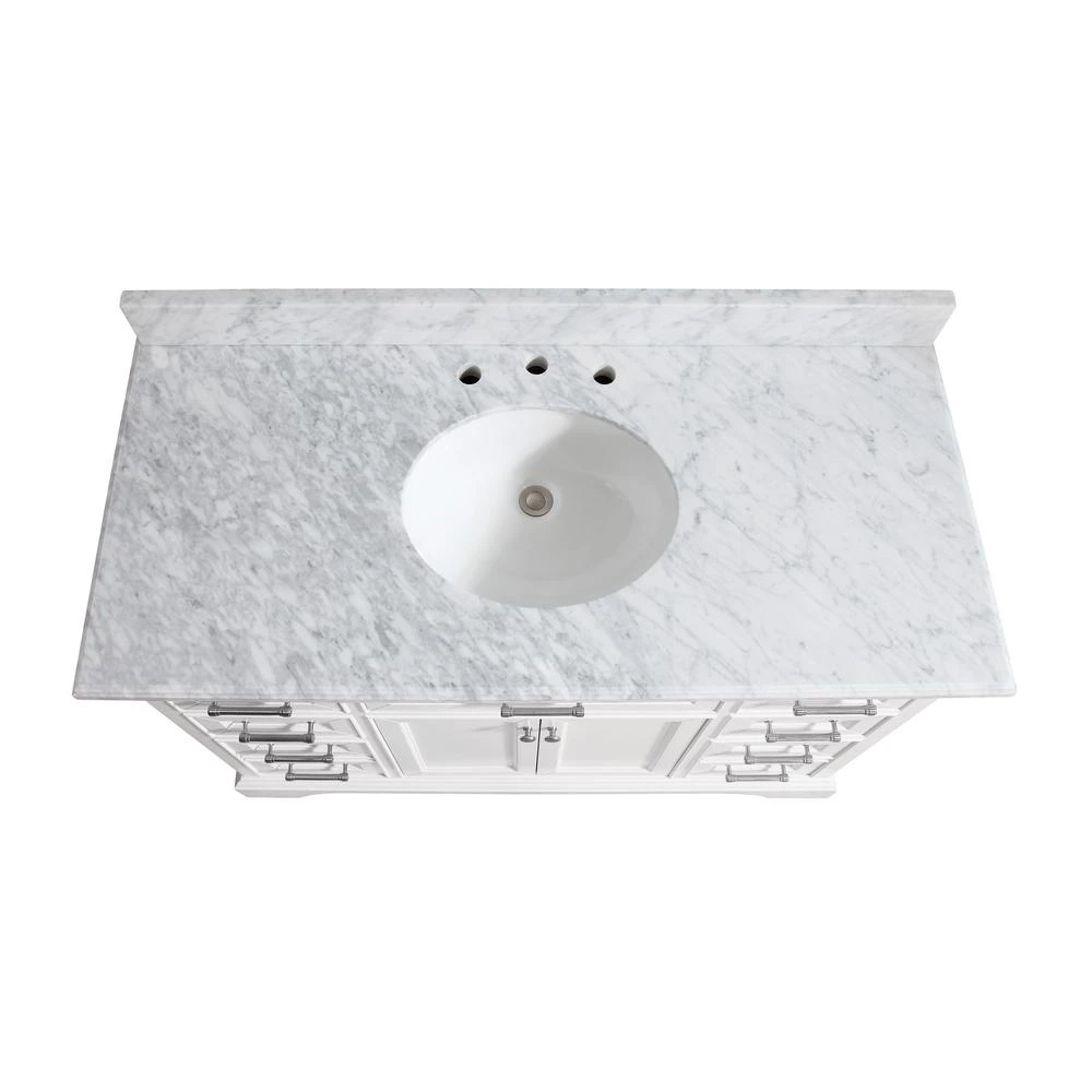 The white finish on the Windlowe 49 in. W x 22 in. D x 35 in. H Bath Vanity Carrara Marble Vanity Top will blend into any existing décor style scheme. The durable wood that it is constructed with is easy to clean and the surface is ample enough to store personal items. This vanity blends contemporary and traditional styles and is sure to bring a timeless touch to your home.